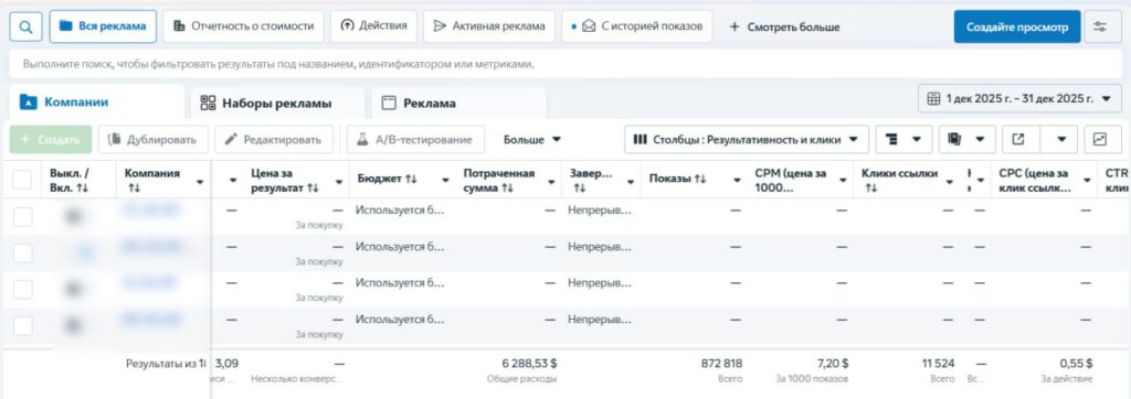 На примере одного аккаунта показываем спенд за декабрь 2025: