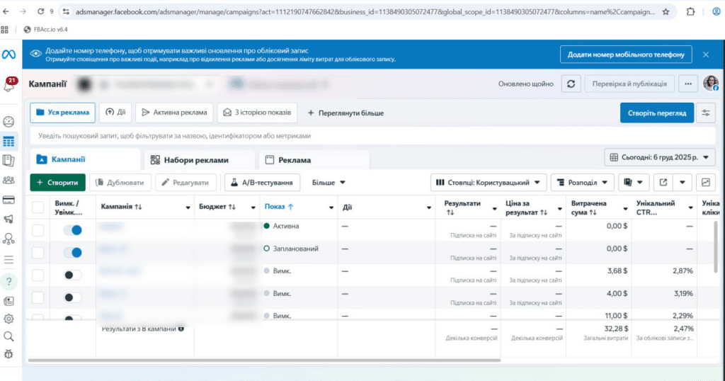 Проведение тестов на “боевых” офферах было одним из самых интересных моментов работы с собственными сетапами, ведь в теории мы всё понимали, но пока не были уверены, что на практике все будет согласно плану. Первый тест мы проводили на сборке из 3 рекламных аккаунтов + фанка + пиксель на вертикали “Трейдинг”.
