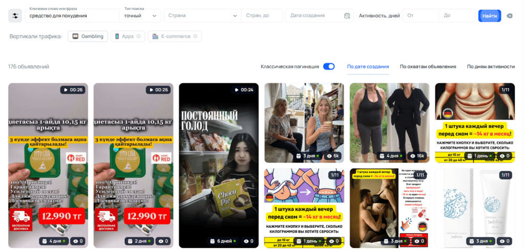 Как мы понимаем, модерация Facebook такую картинку не пропустит. Поэтому идём другим путём. Открываем любой спай-сервис и ищем креативы по похудению.