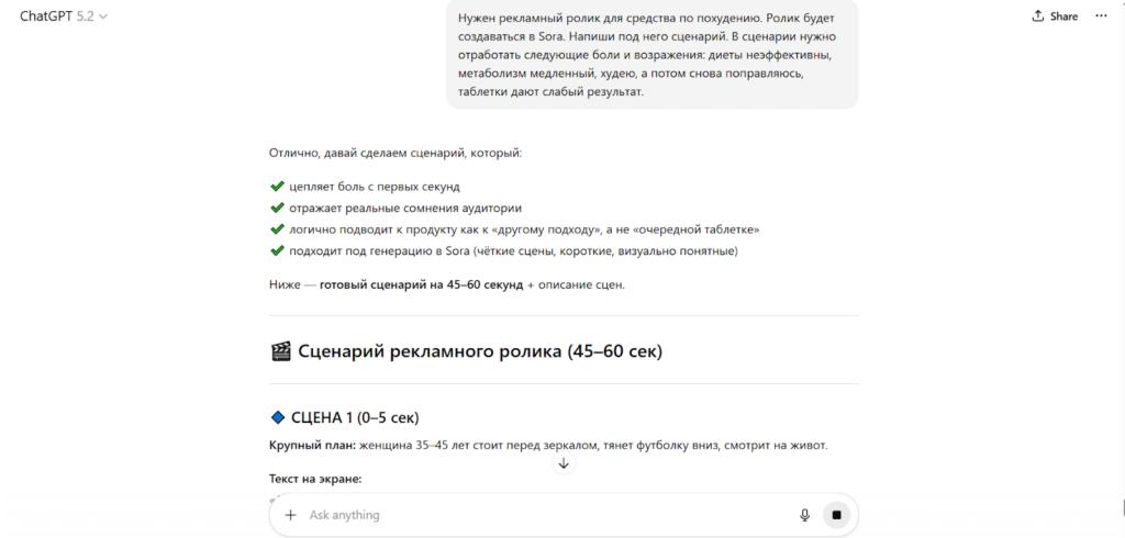 Здесь важно правильно сформулировать промпт. Если вы напишете «Составь сценарий для рекламного ролика по теме похудения», ИИ сделает что-то поверхностное и некачественное.